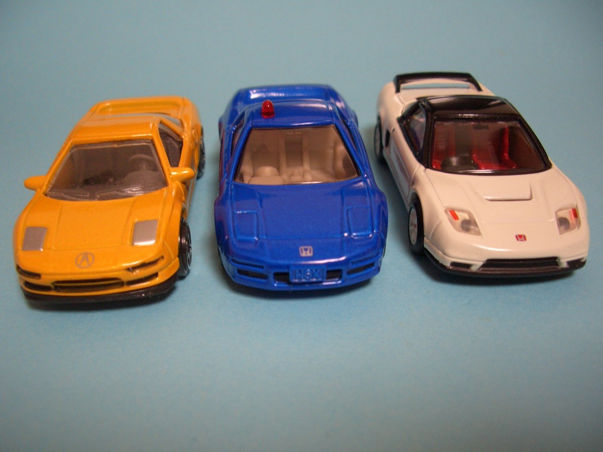 左からアキュラ・NSX / 非売品トミカNSX覆面パト/ トミカリミティッド134 NSX-Rです。